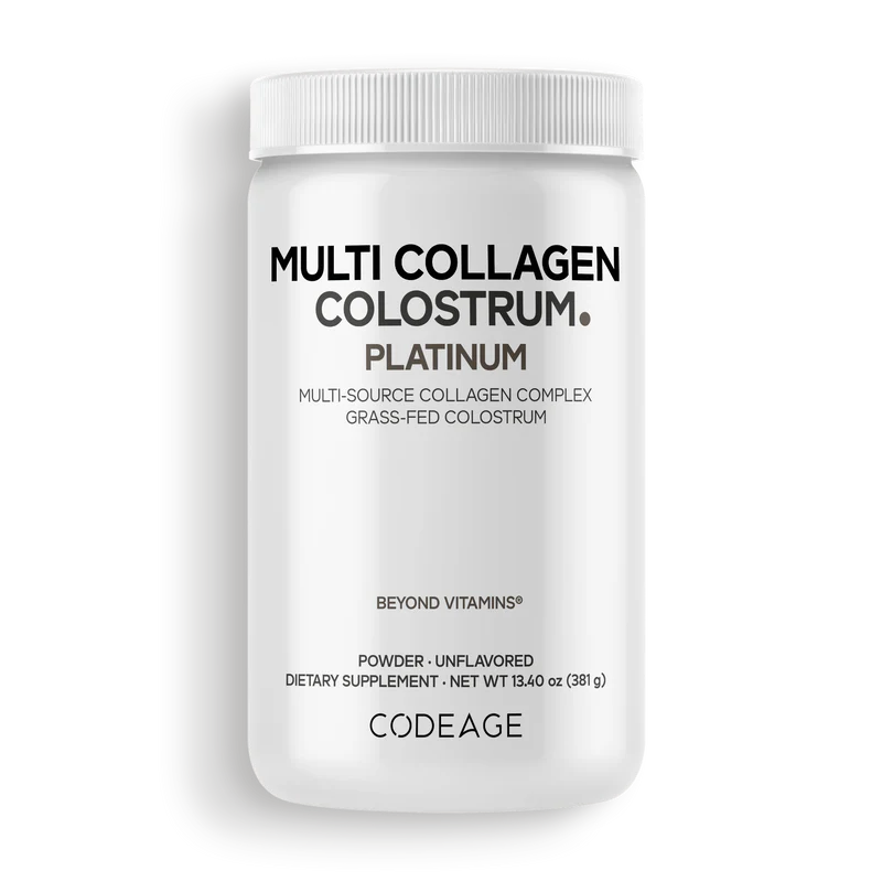 Codeage Multi Collagen Colostrum Platinum сочетает коллагеновые пептиды из высококачественных пищевых источников с бычьим колострумом травяного откорма и лактоферрином. Эта продвинутая формула также дополнена биотином, витамином C и гиалуроновой кислотой для комплексной поддержки организма.