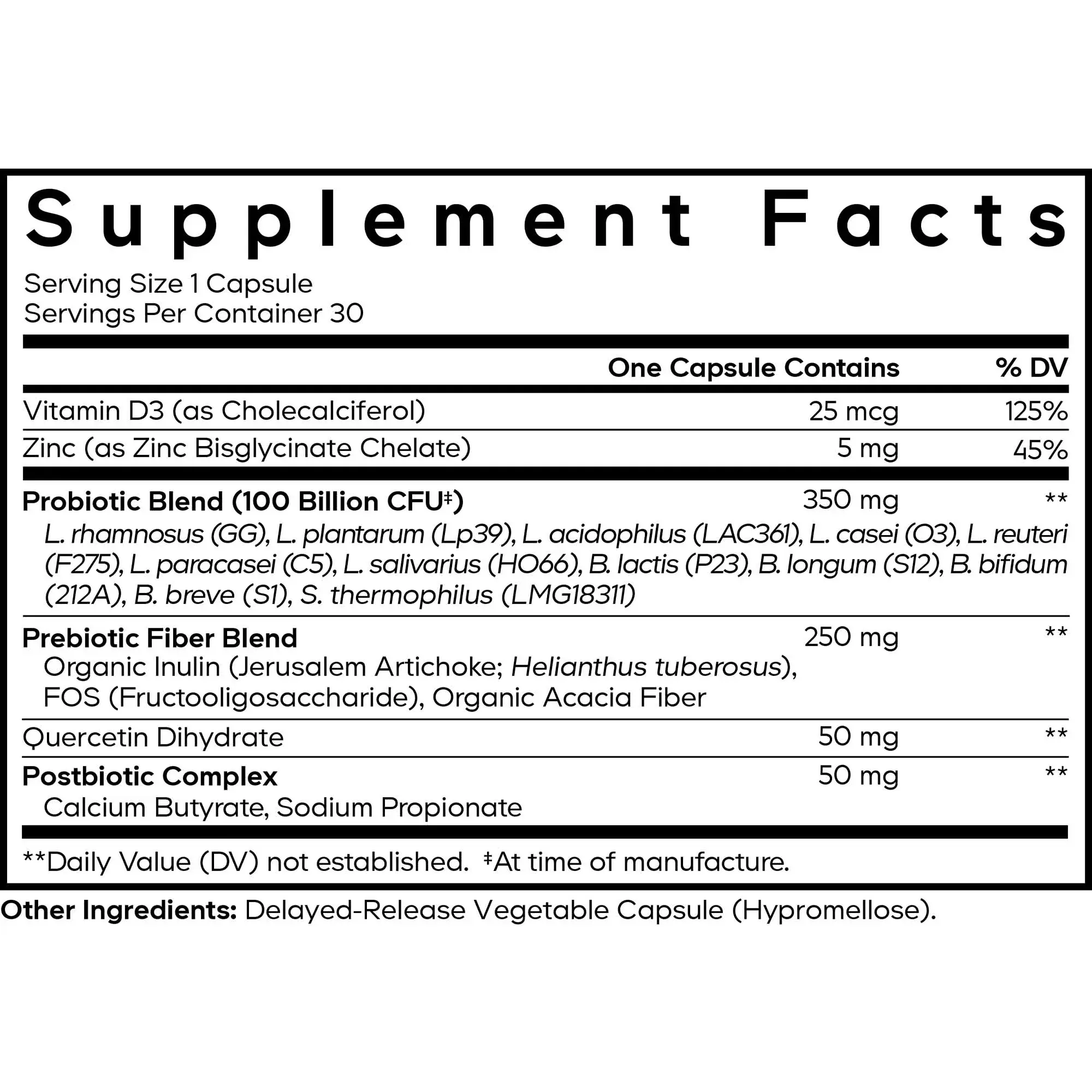 Это полноценная формула «три в одном», сочетающая пробиотики, пребиотики и постбиотики, а также питательные вещества для поддержки иммунитета в одной капсуле.